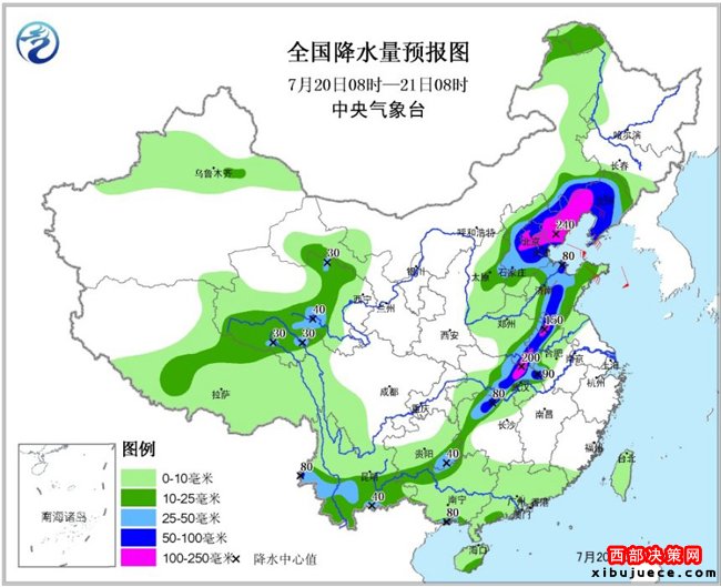 預(yù)計(jì),20日08時(shí)至21日08時(shí),湖南北部、湖北中東部、河南東南部、安徽西北部、江蘇西北部、山東中部、河北中東部、北京、天津、遼寧中南部及云南西部、廣西南部沿海等地有暴雨,其中,河北東北部、遼寧西南部、北京中南部、天津北部以及湖北中部偏北、河南東南部、安徽西北部等地的部分地區(qū)有大暴雨(100~240毫米);上述地區(qū)局地并伴有短時(shí)強(qiáng)降水、雷暴大風(fēng)等強(qiáng)對流天氣,最大小時(shí)雨強(qiáng)50~70毫米,局地可超過80毫米。