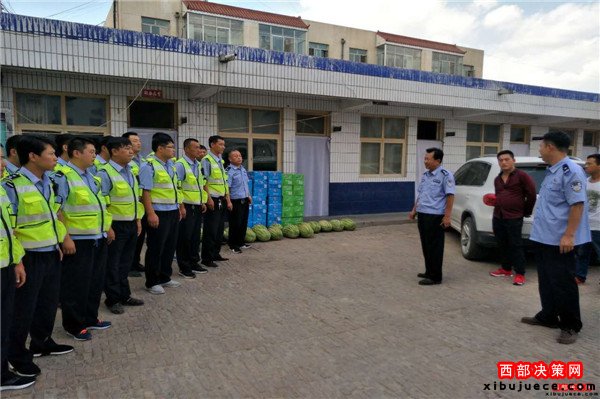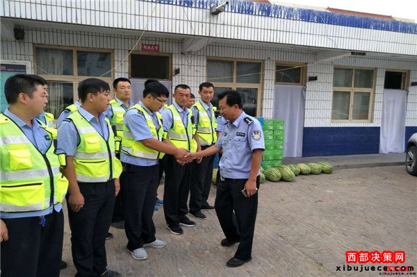 西部決策網(wǎng)訊( 鄒坤 通訊員 崔春月) 時值夏日,天氣持續(xù)高溫,2016年8月10日下午,靖邊縣公安局黨委委員、交警大隊長王世崗、辦公室主任黃瑞峰等一行來到該大隊城區(qū)二中隊慰問在高溫酷熱天氣下堅守崗位的一線民警,深刻表達(dá)了大隊黨委對一線民警的關(guān)心和關(guān)愛,并將防暑降溫物品及時送到了一線民警手中。