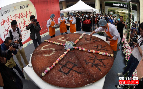 2016年9月3日,在云南昆明一購物中心展出了一個(gè)直徑約2.4米的巨型月餅。這個(gè)巨型月餅是以火腿、食用玫瑰等材料純手工制作而成,總重量達(dá)上百斤。