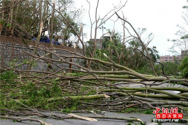 登陸點(diǎn)大量行道樹(shù)被風(fēng)吹倒。