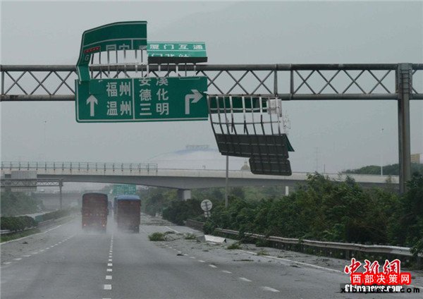 翔安境內(nèi)公路路牌被吹飛。