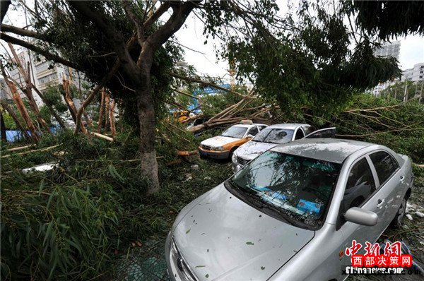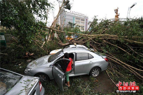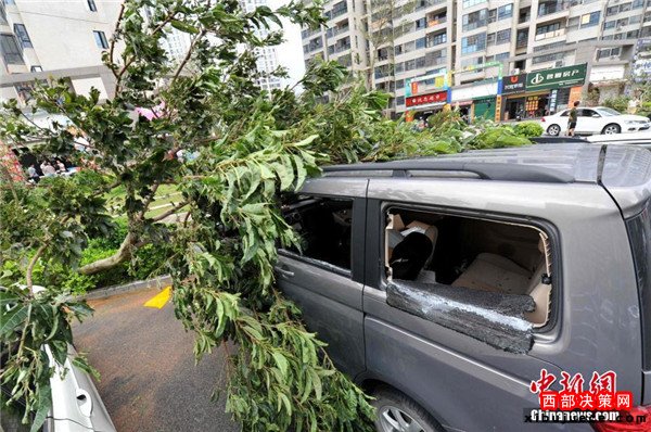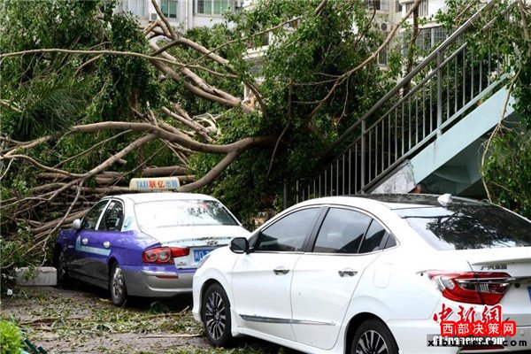 9月15日,今年第14號(hào)臺(tái)風(fēng)“莫蘭蒂”于凌晨3時(shí)05分在廈門翔安沿海登陸,登陸時(shí)中心附近最大風(fēng)力15級(jí)(48米/秒,強(qiáng)臺(tái)風(fēng)級(jí)),中心氣壓945百帕。圖為廈門市區(qū)大批車輛被吹倒的樹(shù)木損壞。