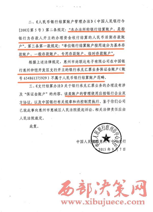 人行惠州分行則認(rèn)定,涉案保證金賬戶不屬于人民幣銀行結(jié)算賬戶管理范籌,無需經(jīng)當(dāng)?shù)厝嗣胥y行核準(zhǔn)和備案,保證金賬戶的資金劃轉(zhuǎn)、使用在不違反國家法律、法規(guī)的前提下,由銀行和單位協(xié)商,按協(xié)議辦理。