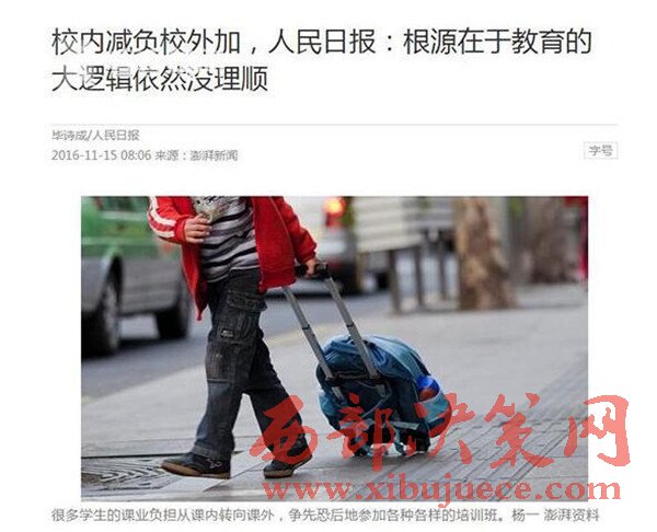 那么到底該從何思考這場學而思的瘋狂?11月15日出版的《人民日報》表示,校內(nèi)減負校外加的現(xiàn)象根源在于,教育的大邏輯依然沒有理順。文章說,如果不能將招錄制度的改革做足做透,不能將教育資源均衡化的工作咬定不放松,那么校內(nèi)減負校外加的怪現(xiàn)狀,就會變著花樣地持續(xù)上演。