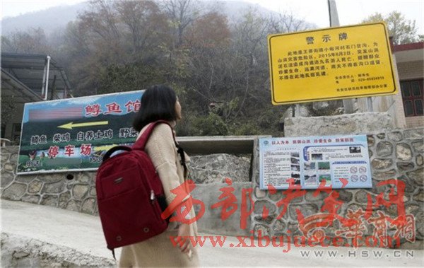 昨日上午,華商報(bào)記者來(lái)到王莽街道小峪河村涉事農(nóng)家樂(lè),該農(nóng)家樂(lè)仍在正常營(yíng)業(yè)。在農(nóng)家樂(lè)門口,立著一個(gè)很顯眼的黃色警示牌,是長(zhǎng)安區(qū)防汛抗旱指揮部辦公室設(shè)置的,上面寫著2015年8月3日突發(fā)山洪造成九人死亡的事情,并提醒群眾遠(yuǎn)離河道,雨天不得在溝口逗留,不得在此亂搭亂建,該牌子。在警示牌下面,有一條用水泥砌成的水溝,從路邊一直通往山上,華商報(bào)記者注意到,在山坡上有水向下流出。