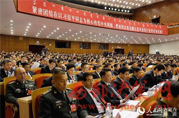 內(nèi)蒙古人民會堂氣氛莊嚴熱烈。來自全區(qū)各條戰(zhàn)線的黨代表,肩負重托、滿懷希望,昂首步入會場。主席臺上方懸掛著用蒙古文、漢文書寫的“中國共產(chǎn)黨內(nèi)蒙古自治區(qū)第十次代表大會”的會標,后幕正中十面鮮艷的紅旗簇擁著金色耀眼的黨徽。二樓的眺臺上懸掛著“緊密團結(jié)在以習(xí)近平同志為核心的黨中央周圍,把祖國北部邊疆這道風(fēng)景線打造得更加亮麗”的橫幅。