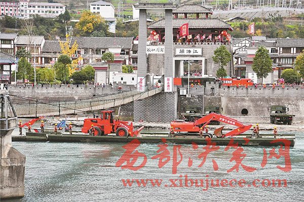 11月22日,聯(lián)合應(yīng)急演練中,我國(guó)自主研制的動(dòng)力舟橋在平武縣南壩鎮(zhèn)穿過(guò)鐵索橋。