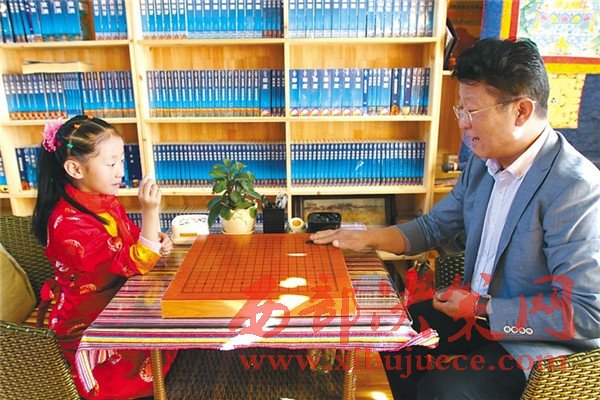 西藏自治區(qū)藏棋協(xié)會(huì)秘書(shū)長(zhǎng)阿旺邊巴正在與孩子下棋。