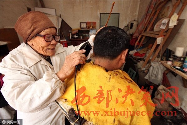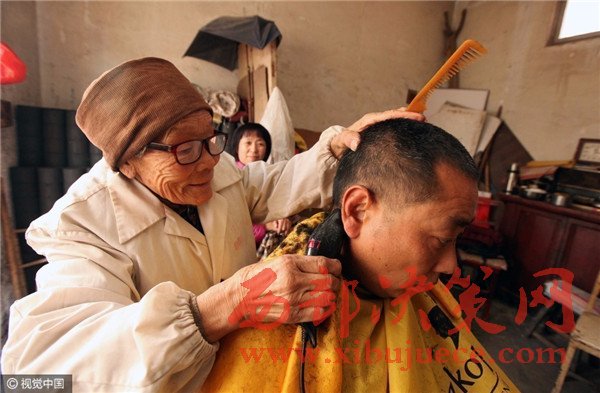 圖為,河南許昌,80歲的蔡瑞云為顧客理發(fā)。