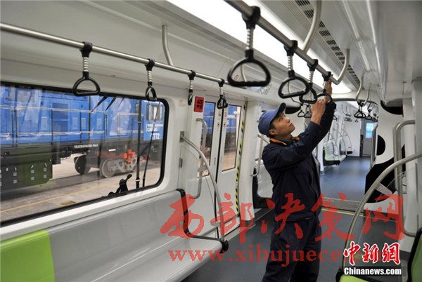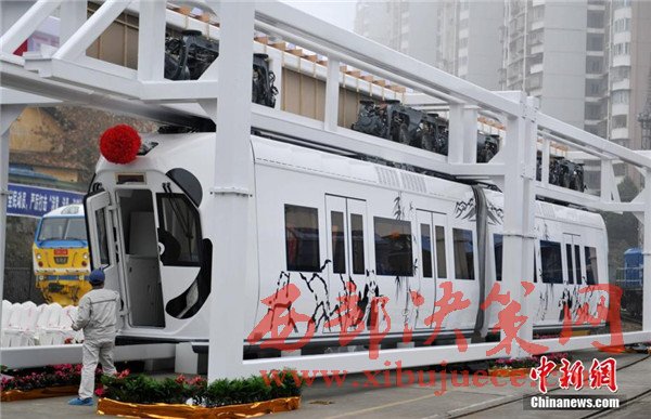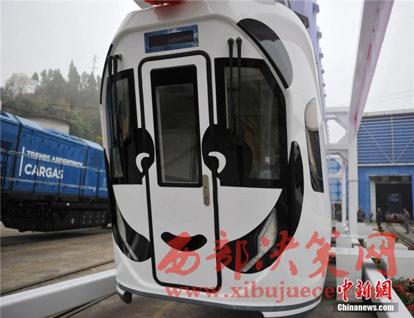 記者在現(xiàn)場(chǎng)看到,正式下線的空鐵車身為卡通熊貓山水圖案,酷似“熊貓”,每列定員144人,時(shí)速最高可達(dá)65公里。列車采用“大容量動(dòng)力蓄電池充放電控制技術(shù)”,通過實(shí)現(xiàn)高倍率放電,提高列車起動(dòng)加速性能及對(duì)極限環(huán)境的適應(yīng)性,同時(shí)能將400千瓦的電制動(dòng)功率全部用于動(dòng)力電池快速充電,實(shí)現(xiàn)制動(dòng)能量回收再利用,延長(zhǎng)蓄電池續(xù)航里程達(dá)120千米。圖為車身外繪制有熊貓山水圖案。
