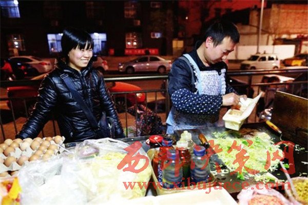 同樣是炒面,河南的楊氏夫婦賣的則是“鐵板炒”,在這個夜市攤干了近4年,每天倆人同出同進,朝夕相處,“有老婆在身邊,干活兒更有動力,做生意也更和諧,更溫情。”