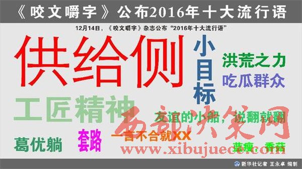 素有“語林啄木鳥”之稱的《咬文嚼字》雜志14日公布“2016年十大流行語”。“供給側”“工匠精神”“洪荒之力”等詞語上榜。