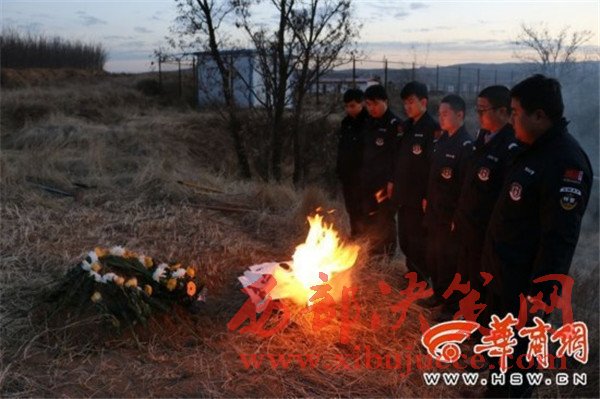 12月8日,府谷縣公安局警犬訓(xùn)導(dǎo)隊(duì)警犬“湯姆”在府谷縣新民鎮(zhèn)執(zhí)行安全隱患排查任務(wù)回到駐地進(jìn)食后出現(xiàn)腹部膨脹的狀況,經(jīng)犬醫(yī)醫(yī)治無效于當(dāng)晚死亡。12月9日,府谷縣公安局警犬訓(xùn)導(dǎo)隊(duì)警察為這個(gè)“特殊的戰(zhàn)友”舉行了簡(jiǎn)樸的葬禮,他們“愿無言的戰(zhàn)友,一路走好。”