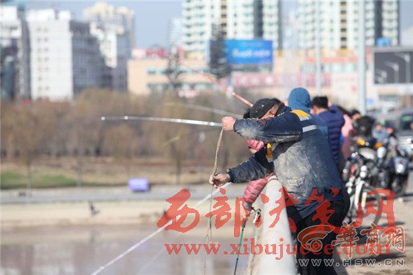 橋上釣魚(yú)人忙得不亦樂(lè)乎,橋下?lián)启~(yú)者也是爭(zhēng)先恐后。咸陽(yáng)湖橡膠壩附近,不少市民拎著袋子和塑料桶在石縫里尋找殘留的小魚(yú)。比起這些撿小魚(yú)的市民,橡膠壩下面水洼處的幾名捕魚(yú)人則要更專業(yè)一些,他們下到水里,用力將網(wǎng)甩出去,一網(wǎng)子下去最少也有10多條大魚(yú)。有些人沒(méi)有撈到魚(yú),便現(xiàn)場(chǎng)從捕魚(yú)人手里花上10元或20元,買(mǎi)上一條大魚(yú)心滿意足地回家去了。