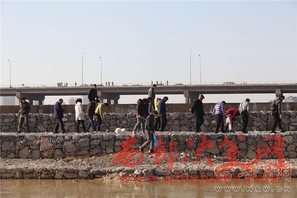 咸陽(yáng)湖橡膠壩附近,滿是捕魚(yú)和撈魚(yú)的人。