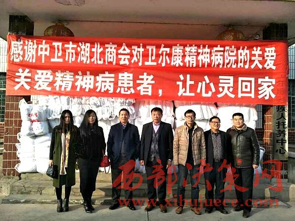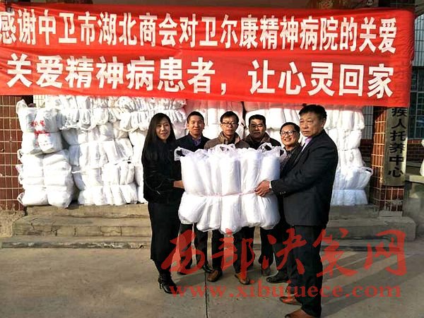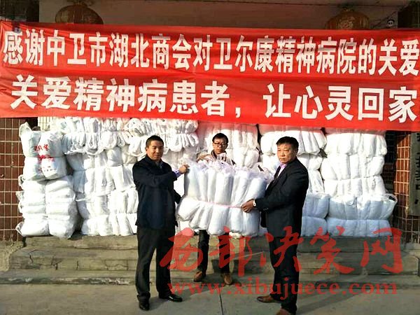 西部決策網(wǎng)訊(黃貞 楊新)2017年1月9日,中衛(wèi)市湖北商會一行數(shù)人在會長朱秀東的帶領下,前往中衛(wèi)市衛(wèi)爾康精神病醫(yī)院進行新年前慰問,并送去價值2萬余元的過冬棉被。