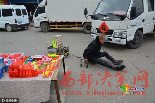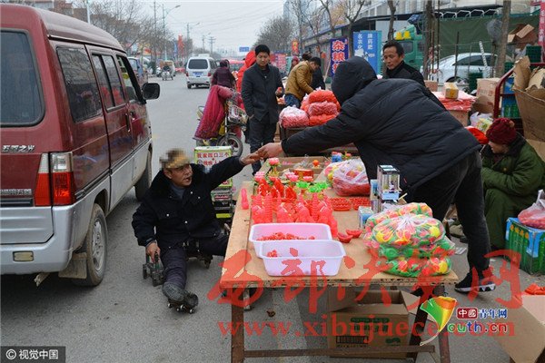 2017年2月6日,在山東省日照市莒縣南關(guān)大集上,今年58歲的葛平九,坐在他自己制作的小車(chē)上,用兩只手臂作支撐,拖著一雙殘腿,穿梭在車(chē)流和人流之間,向路邊賣(mài)蠟燭的攤位要求施舍。有愛(ài)心的攤主會(huì)給他一塊錢(qián),有的會(huì)給他一根蠟燭。