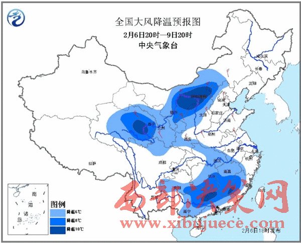 中央氣象臺(tái)預(yù)計(jì),6日夜間至9日,我國中東部大部地區(qū)都將自北向南將先后出現(xiàn)大范圍大風(fēng)降溫和雨雪天氣,平均氣溫將普遍下降4℃以上,其中,青海東部、陜西北部、內(nèi)蒙古中部、山西北部、貴州東南部、湖南中南部、江西中南部、福建西部、廣西北部和廣東北部等地氣溫將下降8℃以上,局地超過10℃!長江以北地區(qū)并伴有4——6級(jí)偏北風(fēng),東部和南部海區(qū)風(fēng)力有7——9級(jí)。