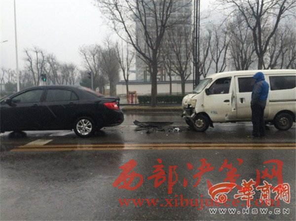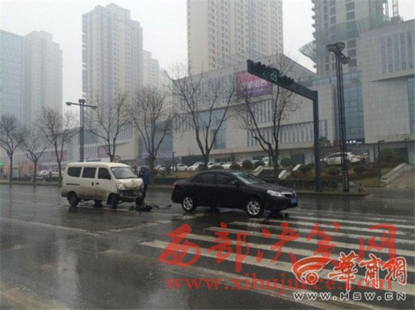 原標題:西安雪天路面濕滑面包車遇紅燈剎車不及撞上私家車