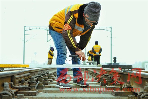 西安鐵路局綏德工務(wù)段職工檢查線路鋼軌狀況。該段通過機車添乘和徒步檢查等方式,加大對凍害、道岔等地段檢查力度,對發(fā)現(xiàn)問題,根據(jù)嚴重程度,及時申請臨時要點進行整治,確保春運期間運輸安全。