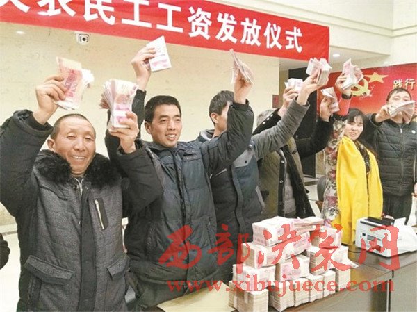 農(nóng)民工代表領(lǐng)到拖欠工資。