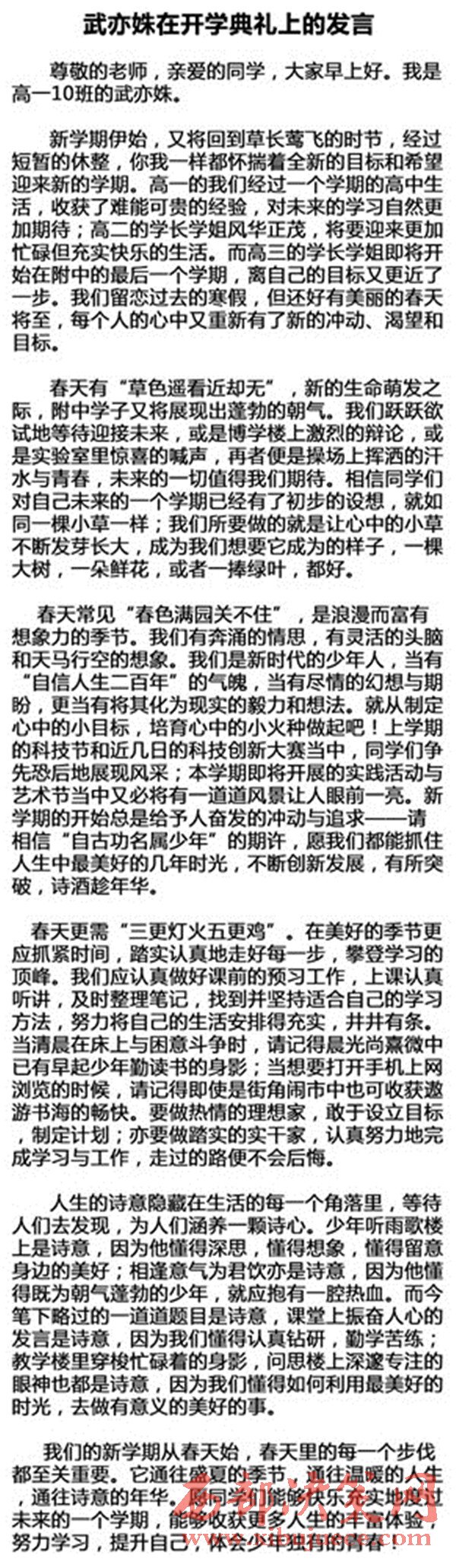 據(jù)復(fù)旦附中官網(wǎng),中小學(xué)紛紛舉行開學(xué)典禮。16日上午,復(fù)旦大學(xué)附屬中學(xué)2016學(xué)年第二學(xué)期開學(xué)典禮隆重舉行。榮獲中央電視臺(tái)第二季中國(guó)詩(shī)詞大會(huì)全國(guó)總冠軍的文理學(xué)院學(xué)生武亦姝上臺(tái)發(fā)言。