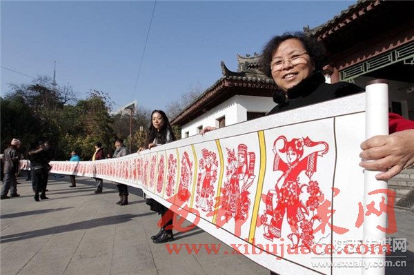 11月30日,在西安市蓮湖公園里,由民間剪紙藝人劉惠霞帶領(lǐng)6名殘疾人學員、3名志愿者,歷時一年多時間,創(chuàng)作的長22米、寬52厘米的《五十六個民族》巨幅剪紙作品。