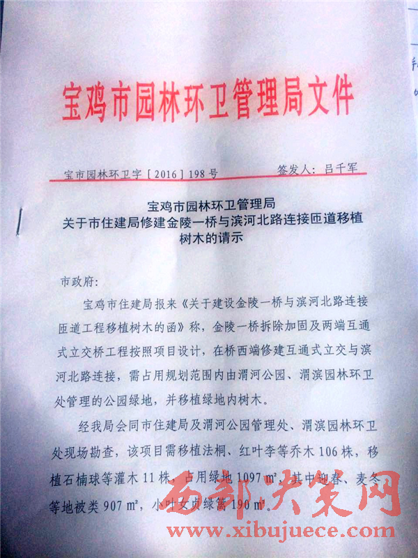 寶雞市人民政府副市長(zhǎng)王琳于2017年1月4日做出了批復(fù):“擬同意市園林環(huán)衛(wèi)局意見(jiàn),建議由市住建局做好涉及苗木移植,市園林環(huán)衛(wèi)局做好移植監(jiān)督檢查和技術(shù)把關(guān),確保樹(shù)木成活”。