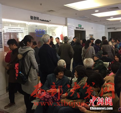 圖為市民們?cè)诒本┐髮W(xué)口腔醫(yī)學(xué)院大廳排隊(duì)掛號(hào)。