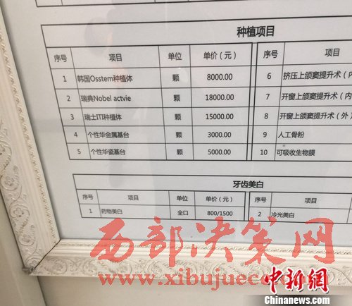 圖為北京一私立醫(yī)院的種牙項(xiàng)目價(jià)格。