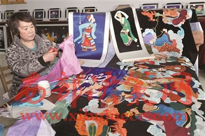 現任青海省民間工藝美術大師、國家非物質文化遺產湟中堆繡的青海省代表性傳承人、湟中縣堆繡協會會長的喬應菊,自幼酷愛民間工藝,三十年前經塔爾寺三絕藝術之一的堆繡老藝僧智華恩師的傳授,她執(zhí)著追求,苦學至今,形成了她特有的堆繡造型和配色特色。她對記者說:“堆繡是一種運用‘剪’、‘堆’技法塑造的獨特藝術,用各色質地不同的綢緞剪出人物、花鳥、山水等各種圖案,再根據設計需求逐一堆貼在黑色底子的大幅布幔上,形成了一個完整的畫面。堆繡分為‘平剪堆繡’和‘立體堆繡’,前者是將各色布料堆貼在事先設計好的圖案上,用彩線或金銀線鑲邊而成;后者則是用各色綢緞剪成佛像、人物、花卉等多種圖形,然后充塞羊毛或棉花,再用絲線繡織。堆繡整體圖案極富有立體感,人物形象逼真,畫面色調和諧,產生出豐富而生動的立體感和織物特有的肌理感,具有浮雕式的藝術效果,深受人們的喜愛”。