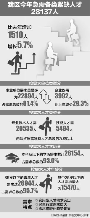 “根據(jù)調(diào)查顯示,這幾年新疆急需緊缺人才需求數(shù)量連年增長(zhǎng),2017年比去年增加1510人,增長(zhǎng)5.7%。”自治區(qū)人力資源和社會(huì)保障廳人力資源市場(chǎng)處處長(zhǎng)趙倩說(shuō)。
