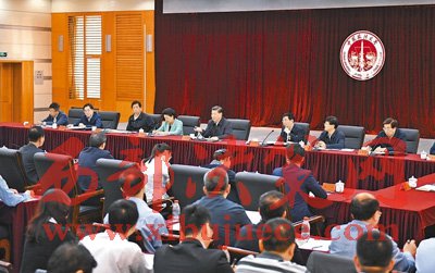 之后,習(xí)近平來到學(xué)生活動中心三層會議室,同中國政法大學(xué)師生和首都法學(xué)專家、法治工作者代表、高校負(fù)責(zé)同志座談。中國政法大學(xué)黨委書記石亞軍、終身教授張晉藩、民商經(jīng)濟法學(xué)院學(xué)生潘輝和北京市朝陽區(qū)人民法院奧運村法庭庭長劉黎先后發(fā)言。他們結(jié)合實際,談教育管理、教書育人、學(xué)習(xí)生活、法治實踐。