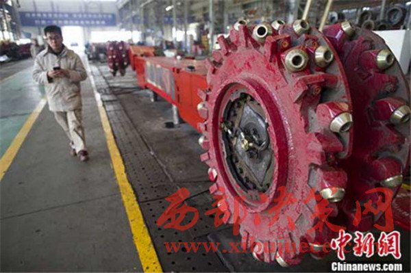 圖為山西太重工人從采煤機前經(jīng)過。