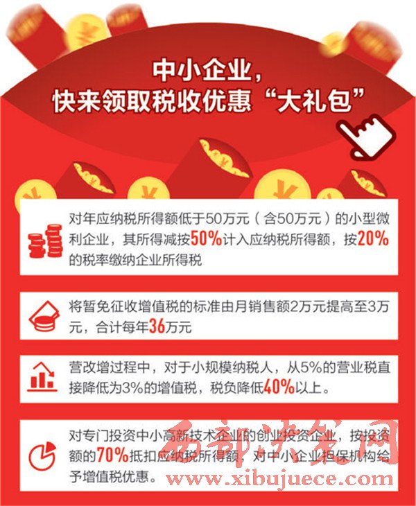 日前國務院常務會議決定,在今年已出臺4批政策減稅降費7180億元的基礎上,繼續(xù)出臺多項降費舉措,預計每年可再減輕企業(yè)負擔2830億元,合計全年為企業(yè)減負超過1萬億元。今年以來,國家持續(xù)推出減稅降費措施,讓企業(yè)輕裝上陣,成為推進供給側(cè)結(jié)構(gòu)性改革、培育我國競爭新優(yōu)勢的重要舉措。就在國務院出臺多項降費舉措的同時,財政部、國家稅務總局也發(fā)出通知,將享受所得稅優(yōu)惠政策的小型微利企業(yè)年應納稅所得額上限由30萬元提高至50萬元,自2017年1月1日至2019年12月31日,對年應納稅所得額低于50萬元(含50萬元)的小型微利企業(yè),其所得減按50%計入應納稅所得額,按20%的稅率繳納企業(yè)所得稅。