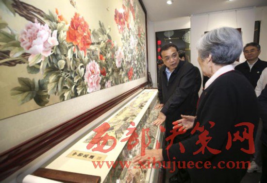李克強(qiáng)2017年5月8日晚來到開封七盛角民俗文化街,在王素花汴繡館長時間駐足。82歲的王素花多年繼承創(chuàng)新宋代傳統(tǒng)刺繡工藝,是汴繡領(lǐng)軍人物??偫碜屑?xì)觀賞后稱贊她用色“多而不雜”,技藝“爐火純青”。
