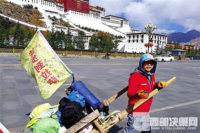 經(jīng)過119天的漫長跋涉,從短袖到棉衣,從酷暑到嚴寒,他用腳板丈量路程。當(dāng)他站在雄偉的布達拉宮前,瞬間感覺到“自己的人生完滿了”。