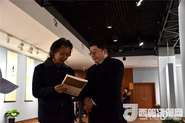 西安工業(yè)大學黨委副書記于孟晨、甘肅省書協(xié)副主席王青彥一同觀看“和天下”書法展。