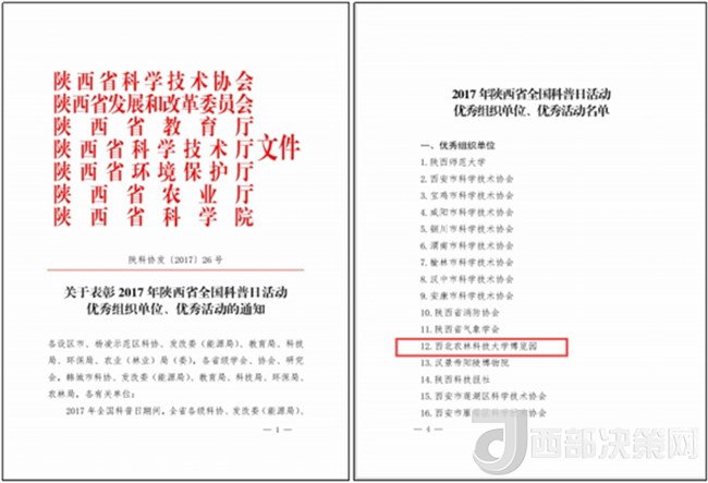 近日,陜西省科協(xié)、省發(fā)改委、省教育廳、省科技廳、省環(huán)保廳、省農(nóng)業(yè)廳和省科學(xué)院聯(lián)合發(fā)布了《關(guān)于表彰2017年陜西省全國科普日活動(dòng)優(yōu)秀組織單位、優(yōu)秀活動(dòng)的通知》,西北農(nóng)林科技大學(xué)博覽園獲評(píng)2017年全國科普日活動(dòng)優(yōu)秀組織單位。
