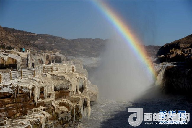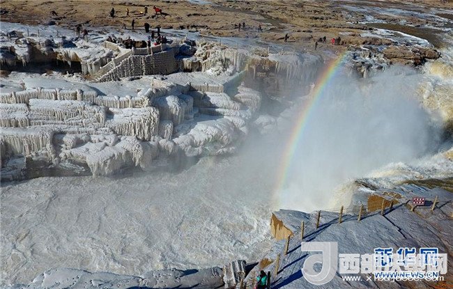 這是12月17日在山西吉縣黃河壺口瀑布拍攝的冰瀑彩虹景觀。當(dāng)日,黃河壺口瀑布出現(xiàn)彩虹景觀。壺口瀑布兩岸姿態(tài)萬(wàn)千的冰瀑,與瀑布上空的彩虹相映成趣,美不勝收。(饒北成 攝)