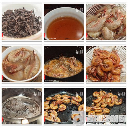 準(zhǔn)備好烏龍茶;加入開水沖泡,第一泡茶水倒掉,其他的茶水沖在碗里,茶葉瀝干水分待用;海蝦去除蝦頭,蝦背剪開;將蝦放入茶水中,浸泡1個(gè)小時(shí),撈出瀝干水分;熱油,下蝦,用中火炸至蝦金黃;取出,再快速復(fù)炸一遍,瀝干油;取一平底鍋,下1湯匙左右的油,溫度足夠時(shí),下茶葉,用中小火炒出茶葉的香味;下蝦,繼續(xù)用中小火炒均勻,炒至蝦變熱;加入椒鹽粉調(diào)味,即可熄火。