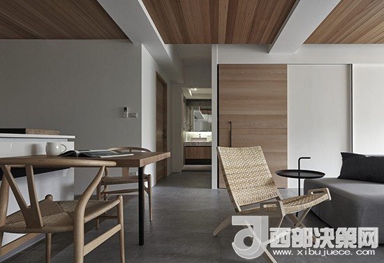 原木和灰色的主線(xiàn)搭配中加入了一只淡黃色抱枕點(diǎn)綴,既不破壞整體的恬淡舒適,又能使空間顯得更加有活力。