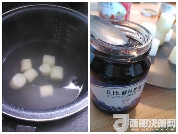 3、繼續(xù)煮到全熟;4、然后切好裝盤,其中一個淋上藍(lán)莓果醬;