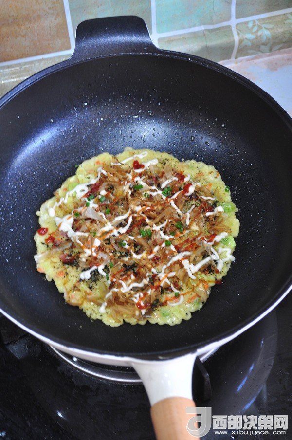 “大阪燒是一種日式蔬菜煎餅,有些地區(qū)根據(jù)日文漢字的寫法,也叫做“御好燒”,為日本關(guān)西的一種民間美食,也是大阪飲食文化的代表。由于外觀的關(guān)系,也有人稱大阪燒為“日本式比薩餅”,可以說放上去的食材,并沒有特殊規(guī)定,一般是自己想吃什么就放什么。吃膩了中式的雞蛋薄餅,換個(gè)口味也別俱一格。做這個(gè)頂重要的是,一定要用不粘鍋,不然想翻面的時(shí)候,底部巴鍋底不動(dòng),而且還容易上面的沒熟,下面的已經(jīng)糊了。”