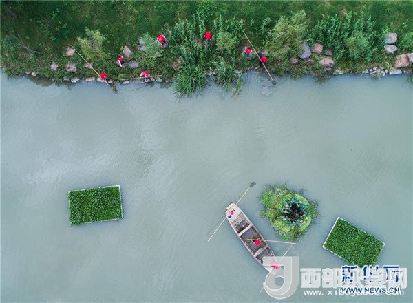 在浙江省長(zhǎng)興縣劉家渡河道南太湖段,河長(zhǎng)帶領(lǐng)專職保潔人員進(jìn)行日常的鄉(xiāng)村河道護(hù)理(2017年10月13日攝)。記者 徐昱 攝