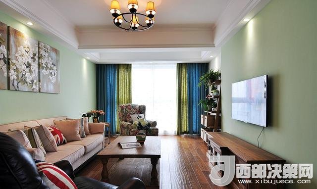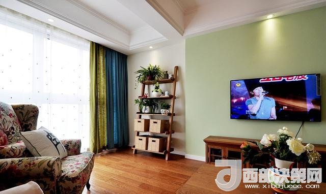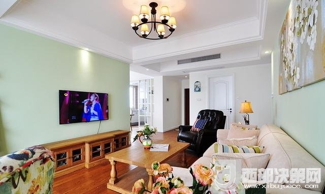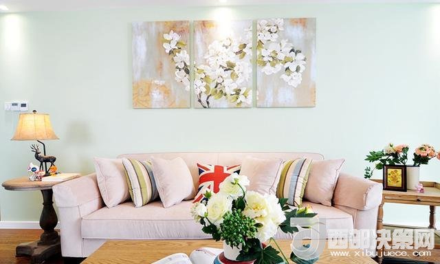 沙發(fā)墻上的油畫和茶桌刪搞得插花,遙相呼應(yīng),給人清新自然之感。