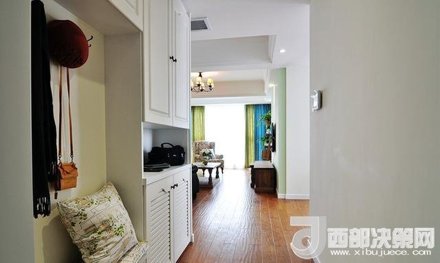 進(jìn)門玄關(guān),貼壁做了一排的櫥柜,模仿國外家居設(shè)計(jì),做了一個(gè)連體的矮柜換鞋凳,上方安裝掛鉤吊衣服。