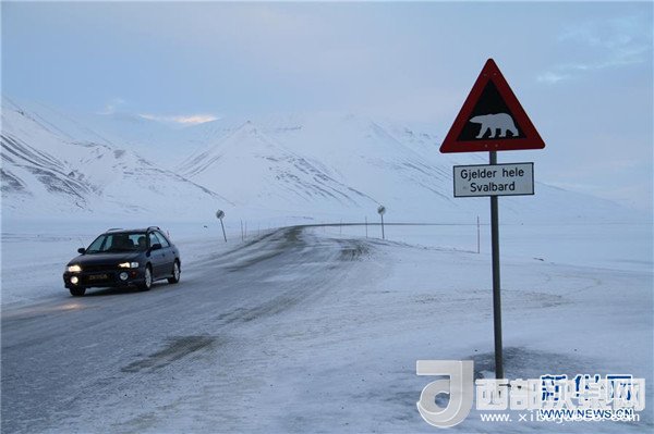 2月25日,在挪威斯瓦爾巴群島首府朗伊爾城,一輛汽車從提示北極熊出沒的警示路標(biāo)旁駛過(guò)。記者梁有昶攝