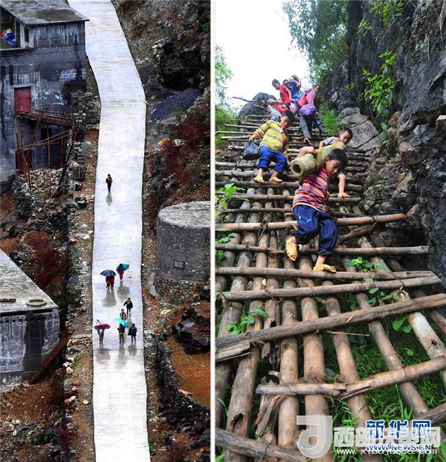 2012年9月3日,廣西大化瑤族自治縣板升鄉(xiāng)弄勇村弄頂屯的孩子們扛著生活用具去學(xué)校(右圖);2017年1月11日,水泥公路已經(jīng)從學(xué)校修通到家門口(左圖)。隨著脫貧攻堅工作不斷推進(jìn),原本“千重山,萬層嶺,不通水,不通電”的廣西大石山區(qū)發(fā)生了翻天覆地的變化。記者黃孝邦攝