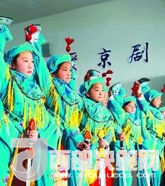 江蘇省海安縣城東鎮(zhèn)西場(chǎng)小學(xué)京劇社團(tuán)的小票友在排練京劇節(jié)目《霸王別姬》。徐勁柏?cái)z/光明圖片
